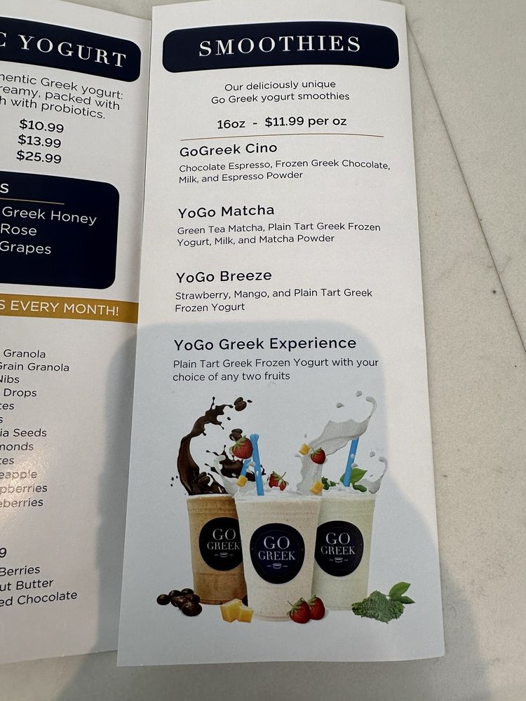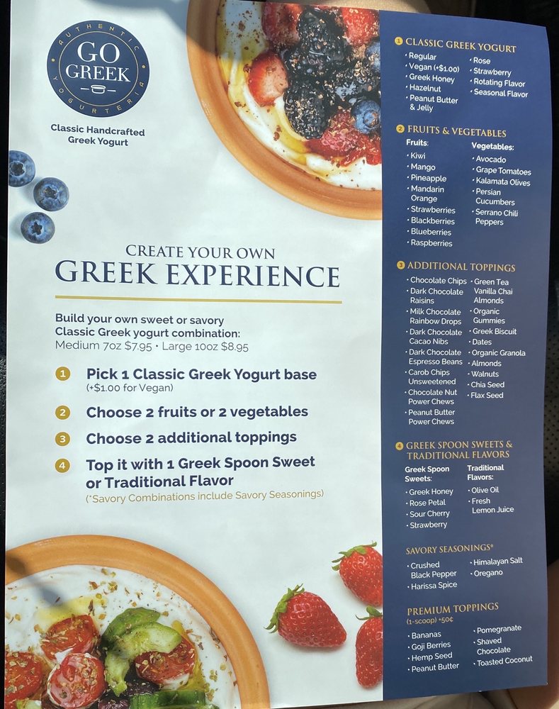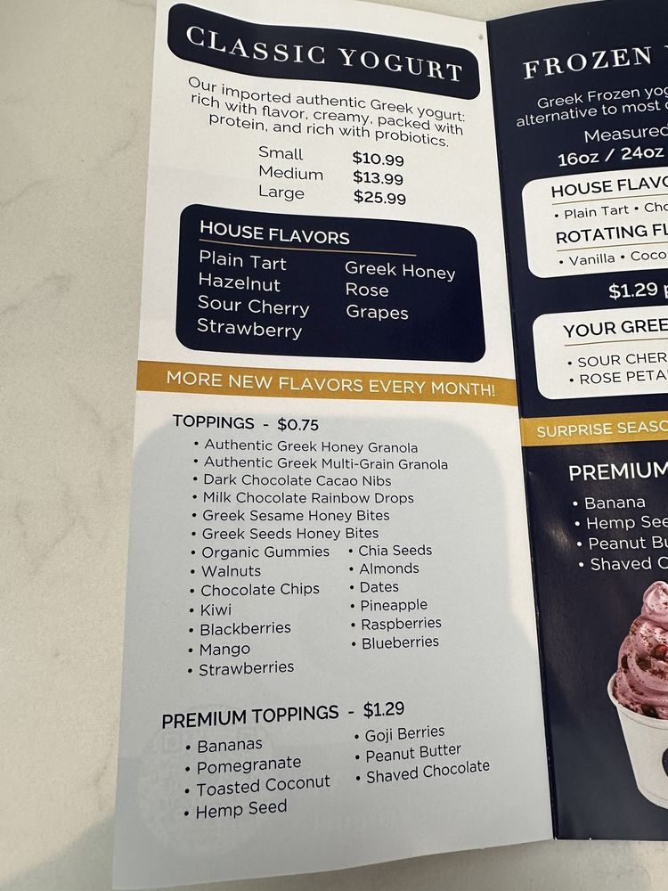 Introducing the menu at Go Greek Yogurt, a dessert and breakfast spot in Beverly Hills, CA. This classy establishment offers a variety of dairy-free and vegan options, including Greek bowls like the Althea Sweet Greek Bowl with fresh berries and honey, and the Aseco Savory Greek Bowl with avocado and jalapeños. Their frozen yogurt selection includes flavors like Greek Honey and Vegan Coconut. For a lighter option, try their Fresh Yogurt with flavors like chocolate, strawberry, and mango. With amenities like outdoor seating, free Wi-Fi, and happy hour specials, Go Greek Yogurt is a great spot for a healthy and delicious meal. Don't miss out on their unique yogurt creations and friendly service.
